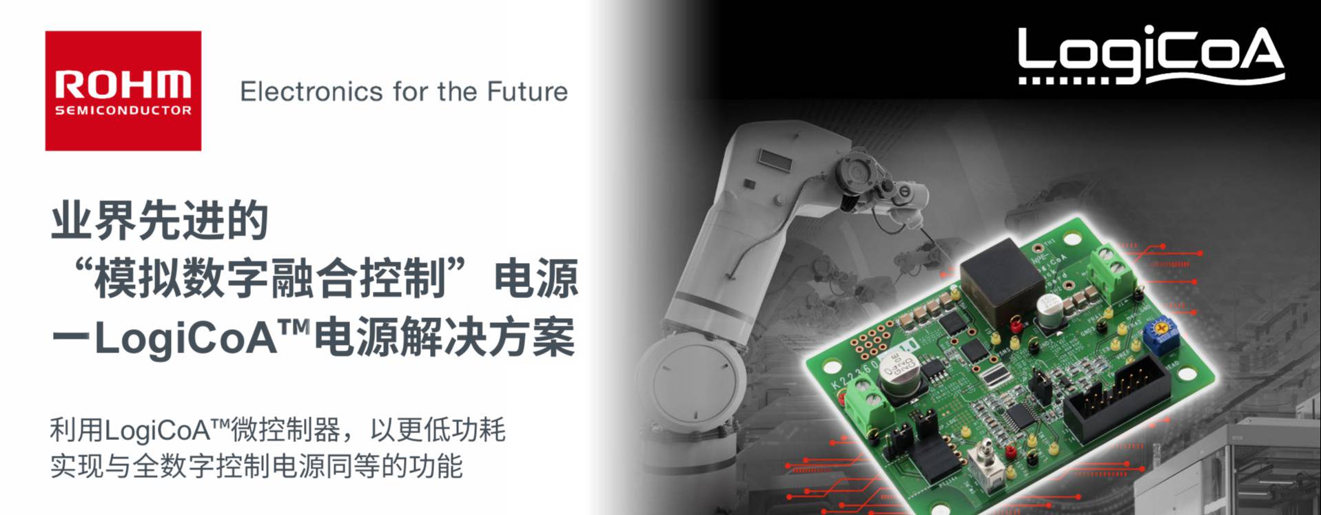 在这种背景下,为了解决中小功率范围的电源控制课题,ROHM开发出业界首款基于LogiCoA™微控制器的“模拟数字融合控制”的LogiCoA™电源解决方案。